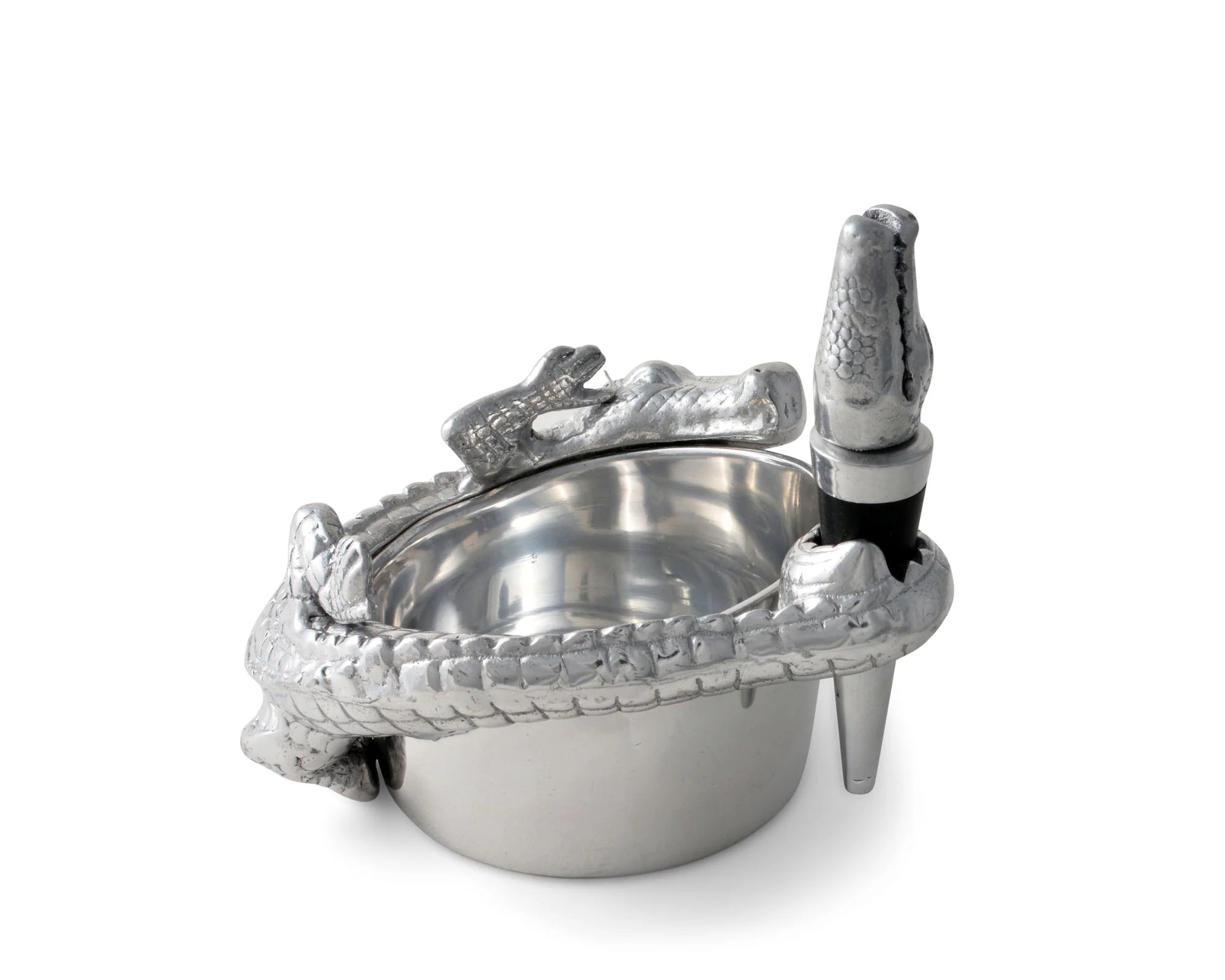 This Arthur Court alligator wine coaster and stopper set features a friendly gator nestled up to your favorite fruit of the vine. The shiny reptile that wraps its scaly body and tail protectively around the edge of the wine coaster just asks for admiration. Meanwhile, a wine stopper crowned with a finely crafted alligator head keeps wine fresh when you put the evening on pause. This 4 x 3-inch ornate barware lies flat against your bar or kitchen counter for easy display or tucks away to lie in wait in your cupboard. If you decide to take this sharp-toothed reptile on the prowl, it's compact and lightweight so that it won't swamp you down on the trek. This alligator wine coaster and stopper set from Arthur Court keeps your wine safe and sound.