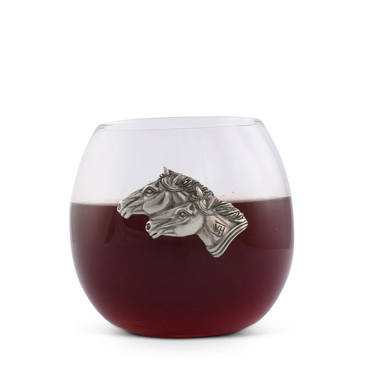 Equestrian Style: This horse-themed stemless wine glass boasts a pewter horse emblem, offering long-term beauty, and a rounded base for stability, adding a sophisticated touch to your entertaining space.