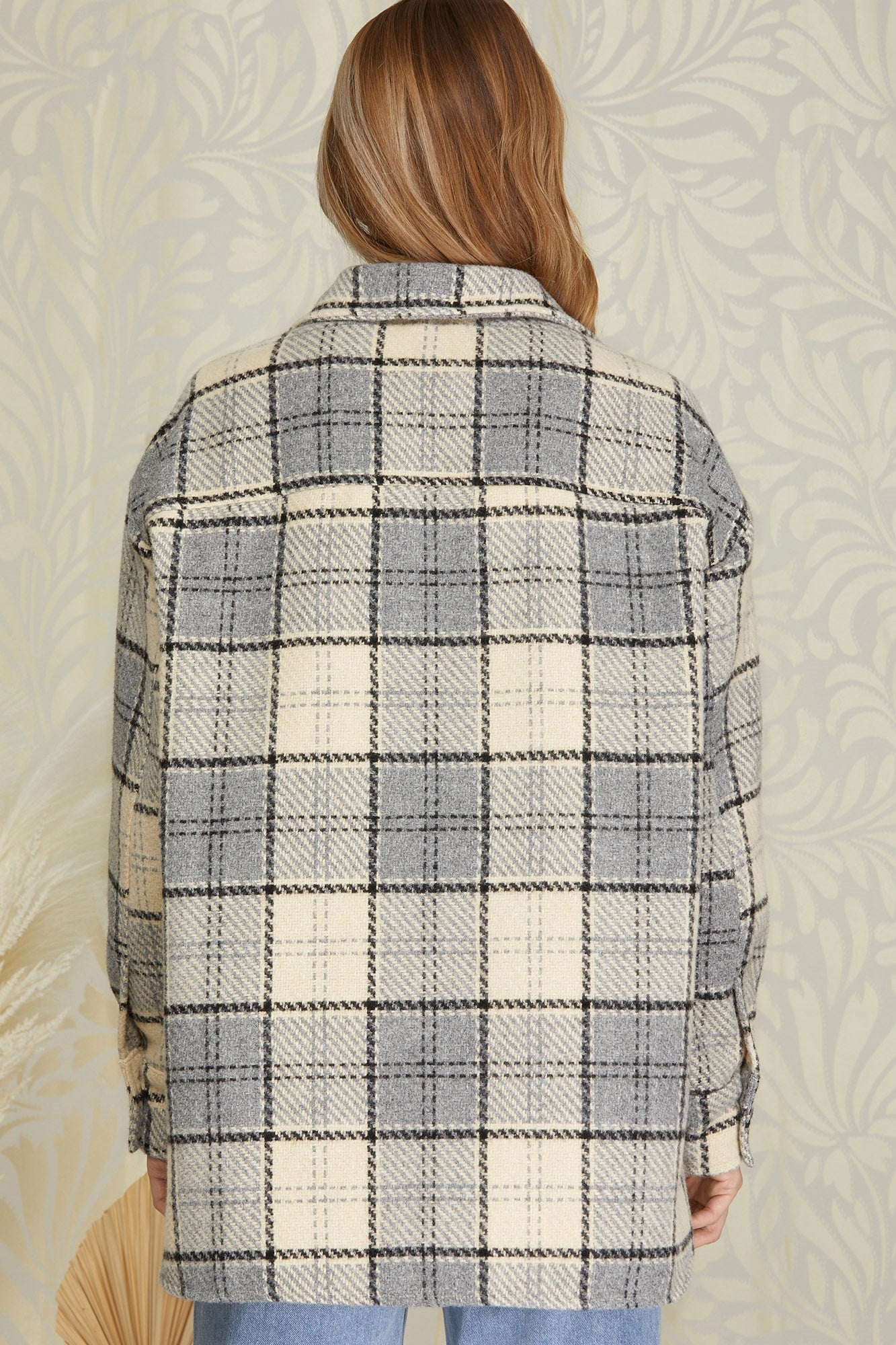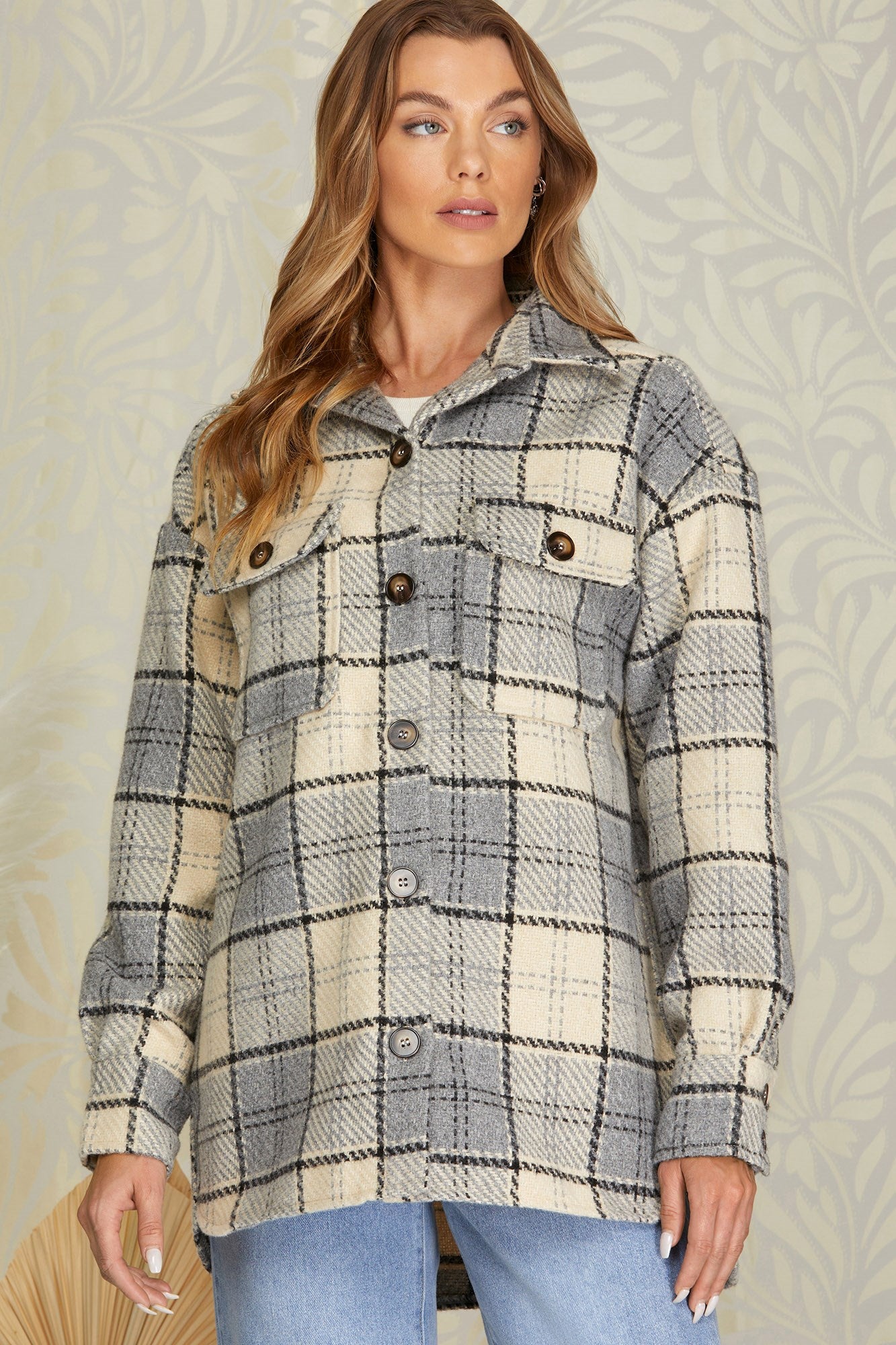 LONG SLEEVE WOVEN PLAID SHIRT JACKET WITH FRONT POCKETSMODEL IS 5'8