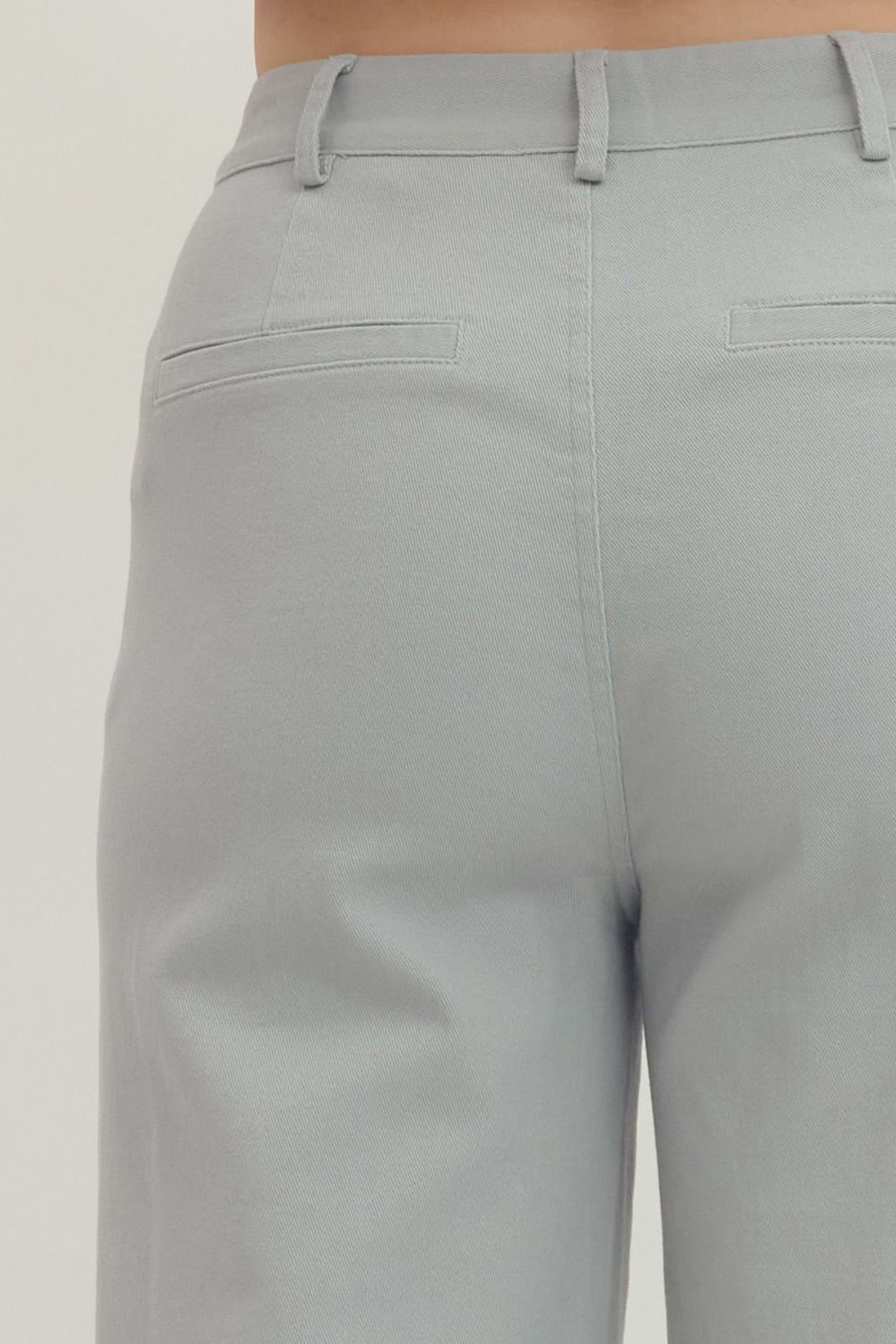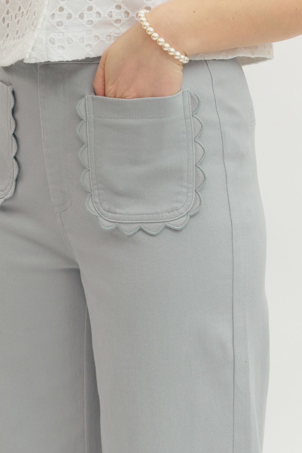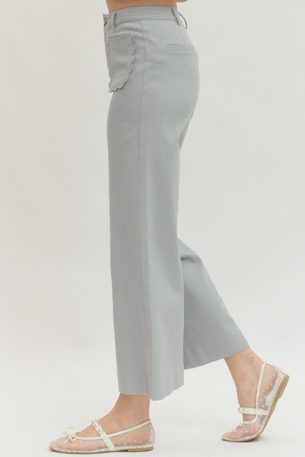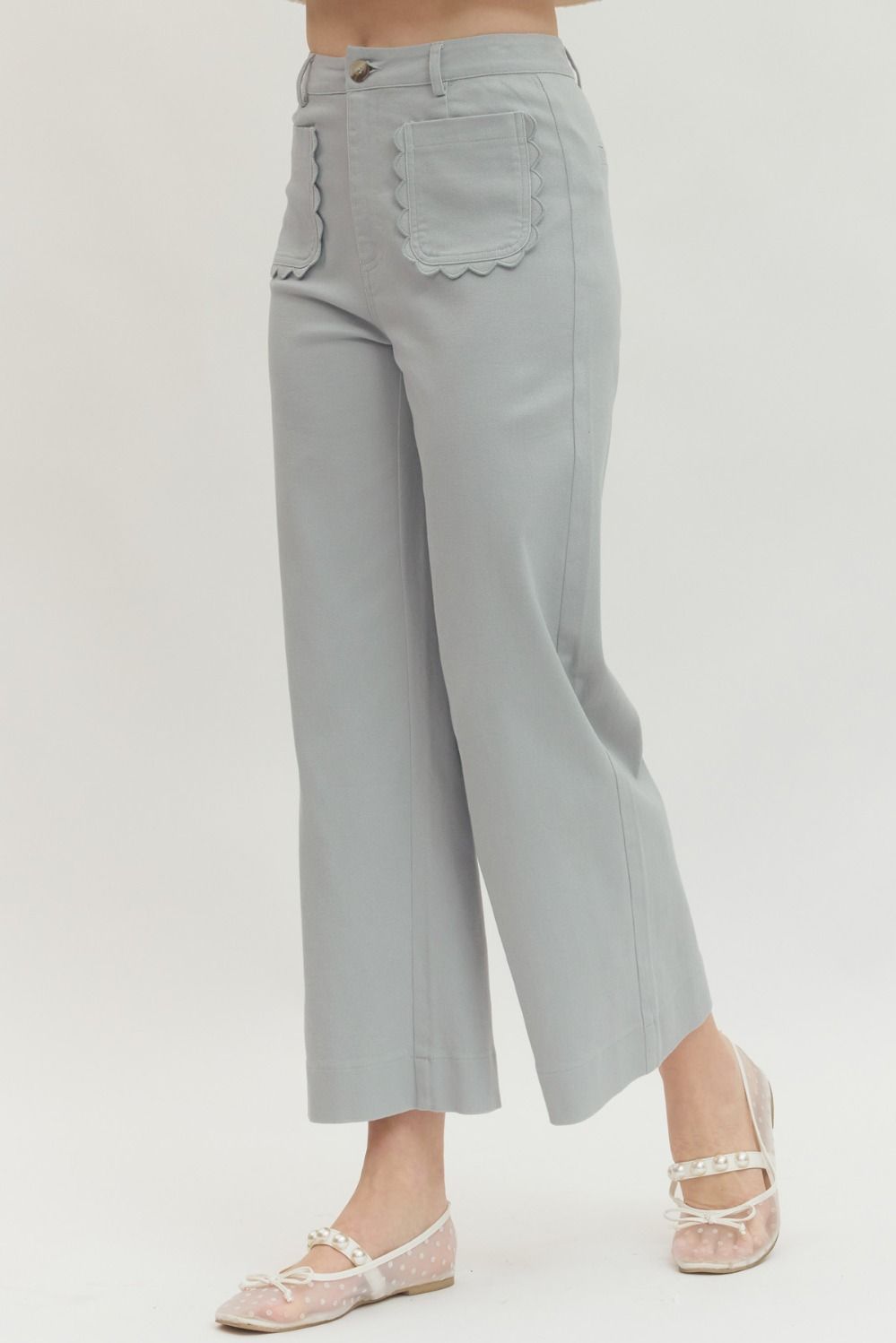 Solid wide leg pants featuring scallop accent trim at front pockets. Zip-fly button front closure. Front and back pockets. Unlined. Woven. Non-sheer. Lightweight.
