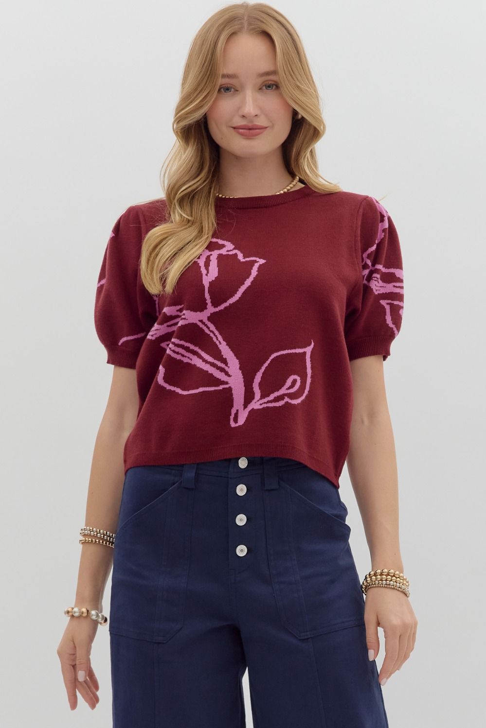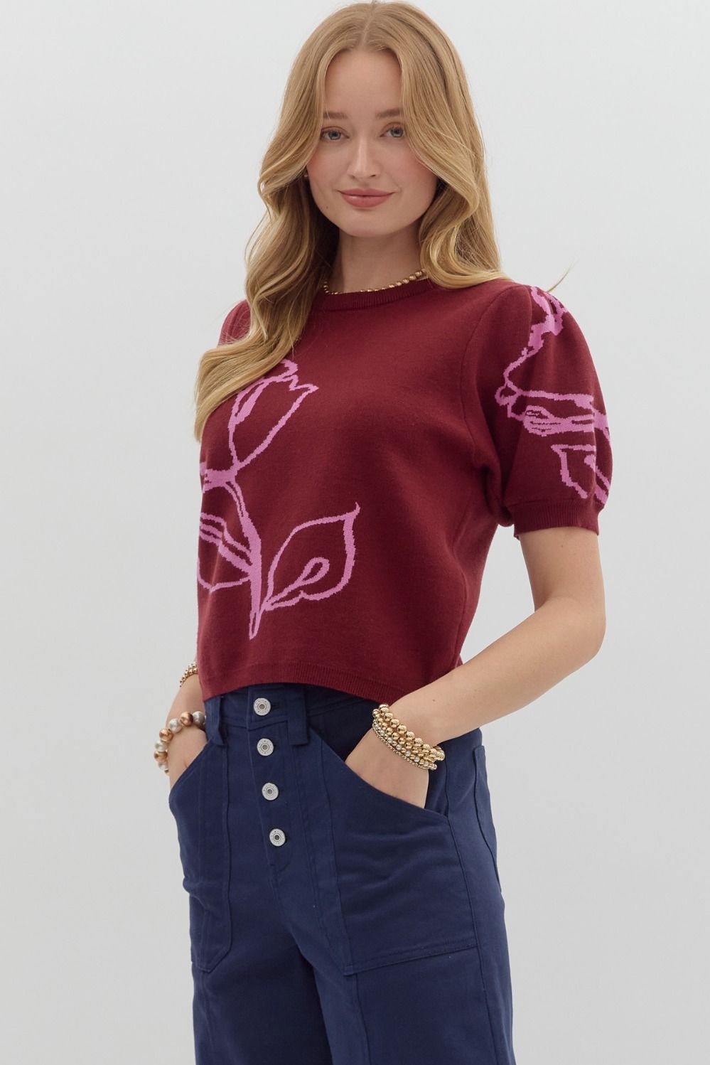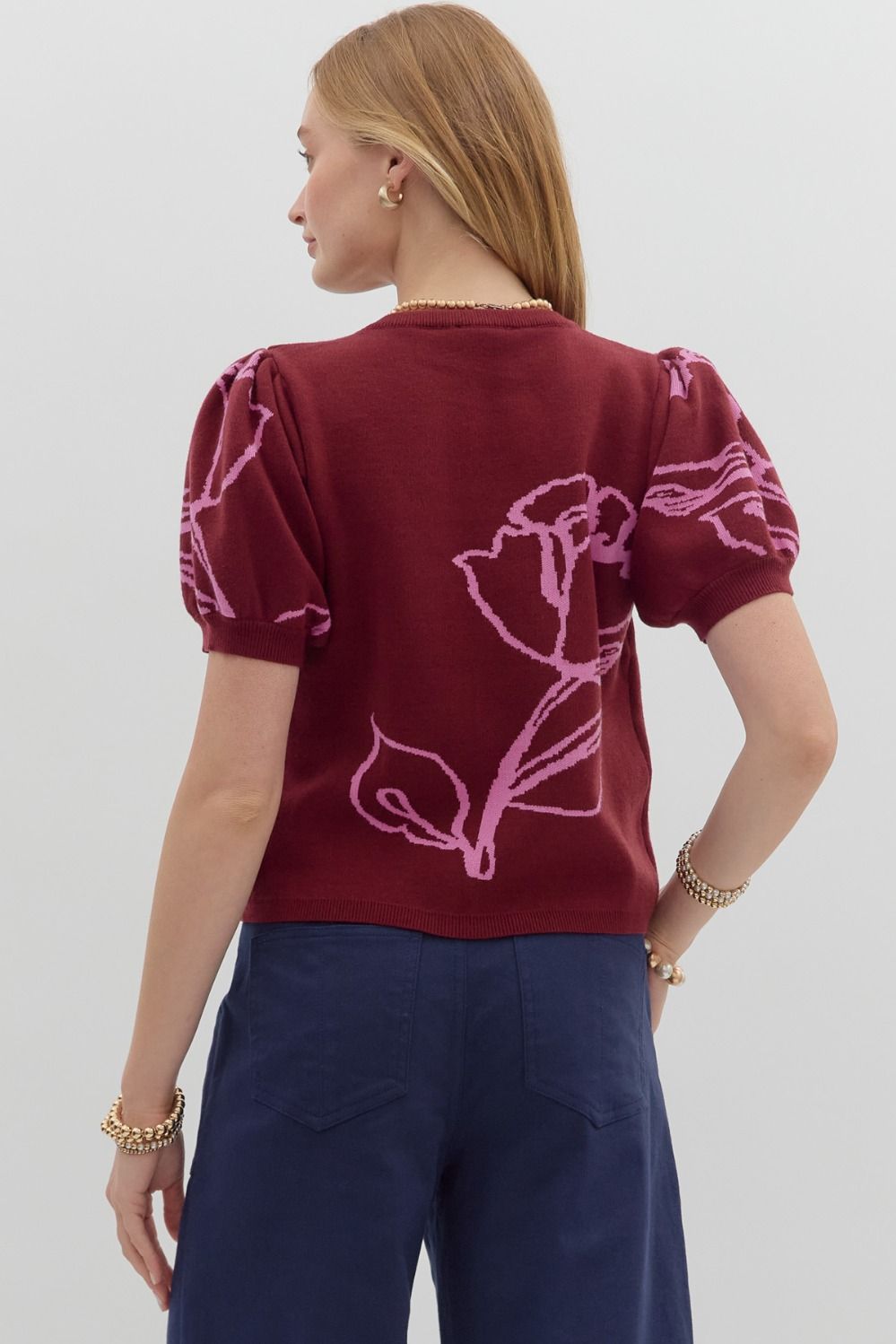 Floral motif short puff sleeve sweater knit pullover. Unlined. Knit. Non-sheer. Lightweight.