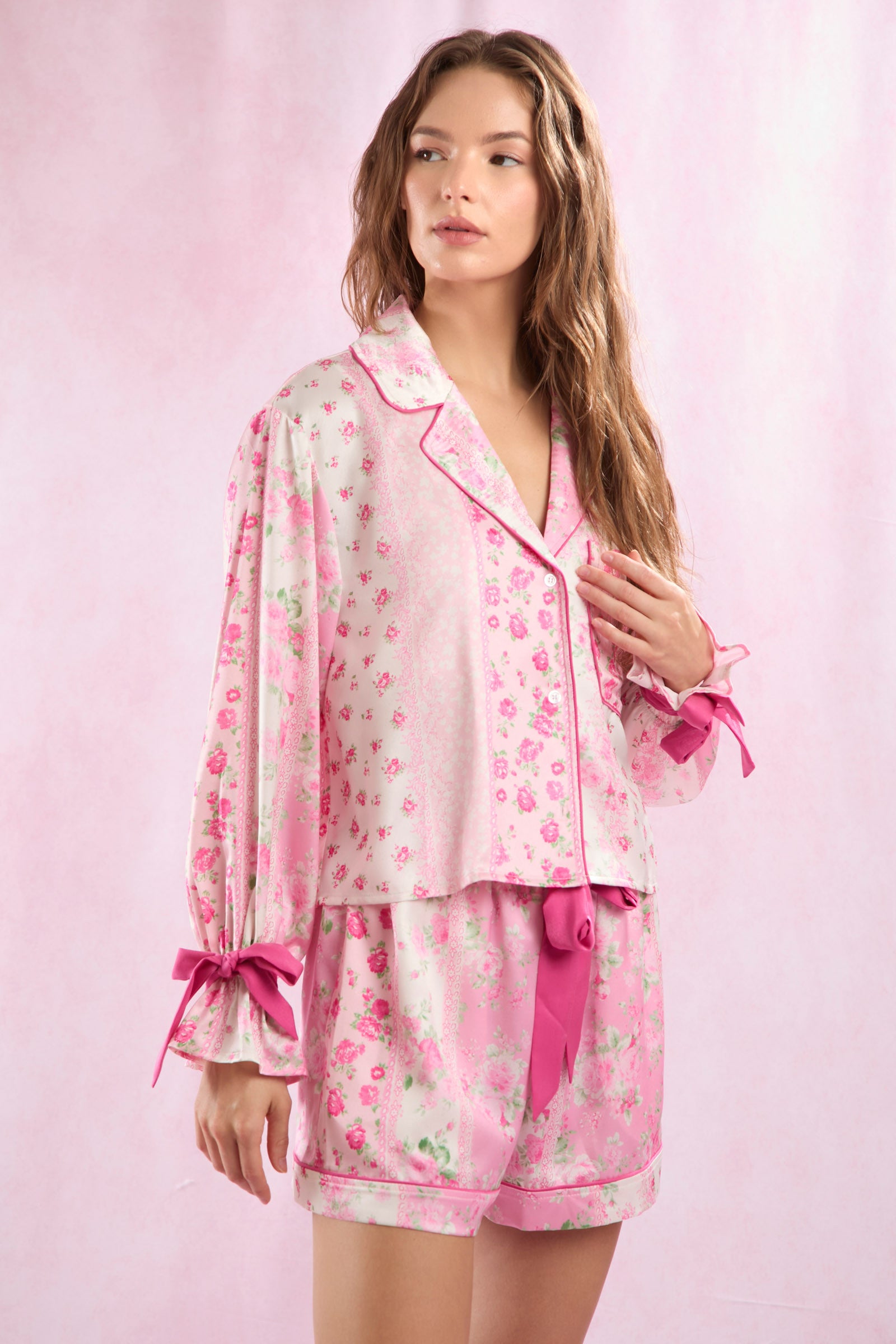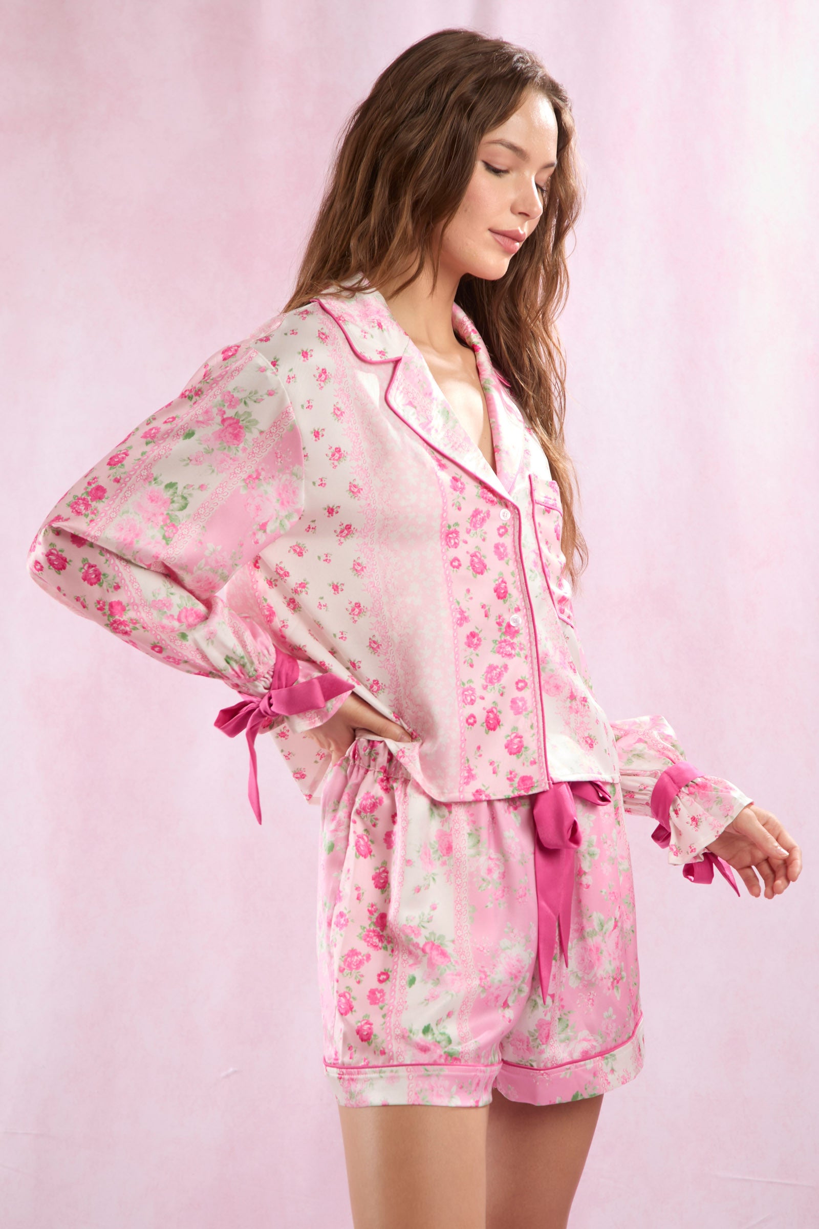 Floral Printed Satin Tied Front & Cuffs Shirt & Shorts Pajamas