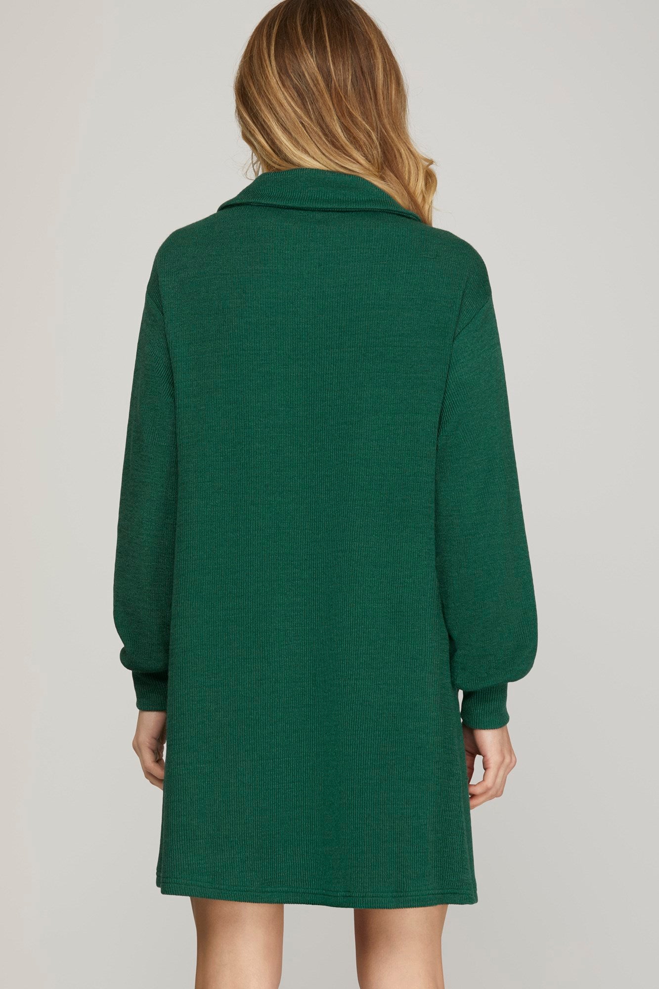 LONG SLEEVE KNIT BUTTON DOWN COLLAR DRESS WITH POCKETSMODEL IS 5'8" AND WEARING SIZE SMALL