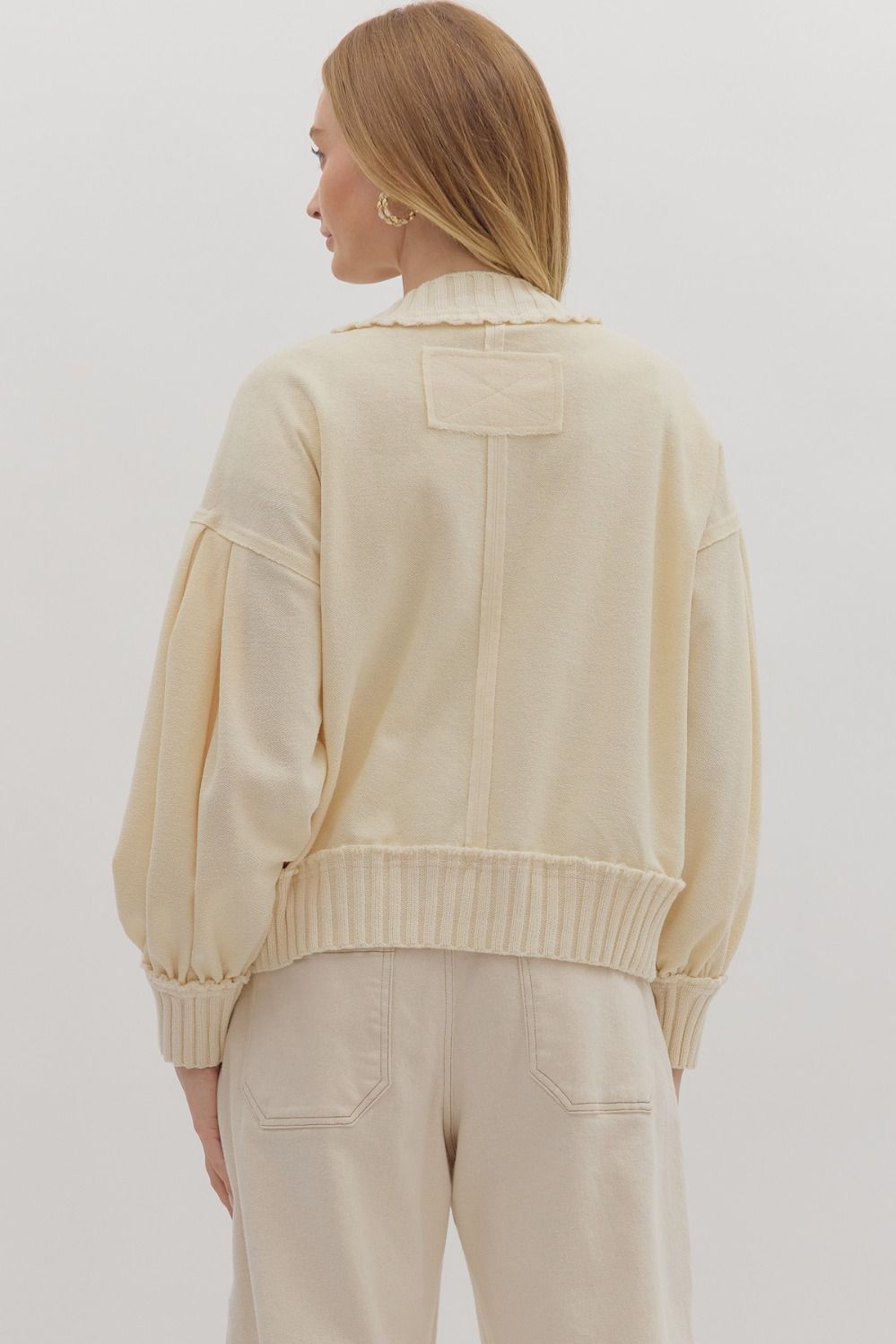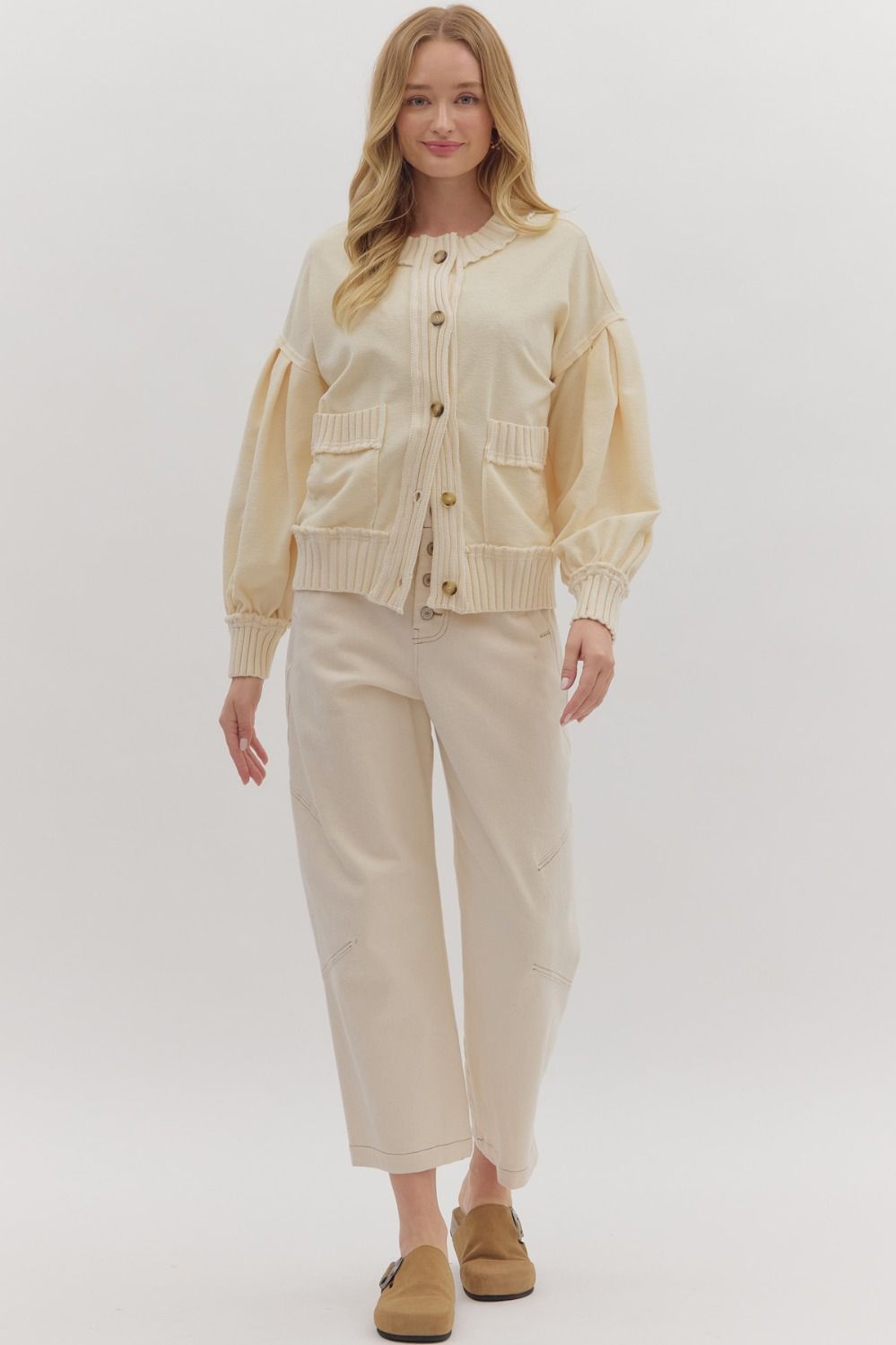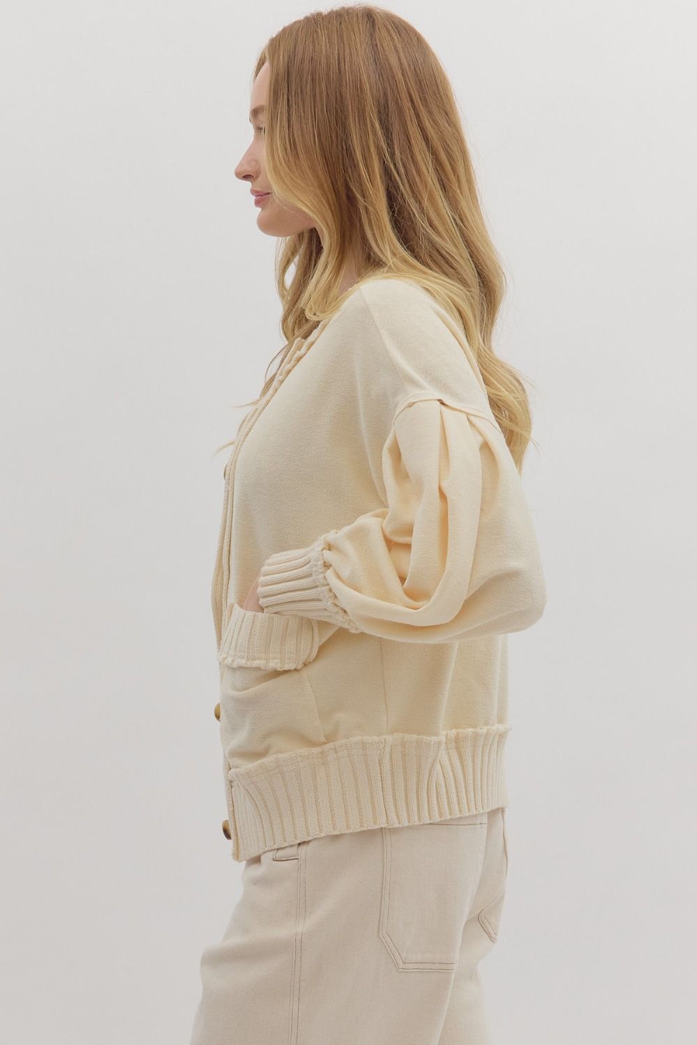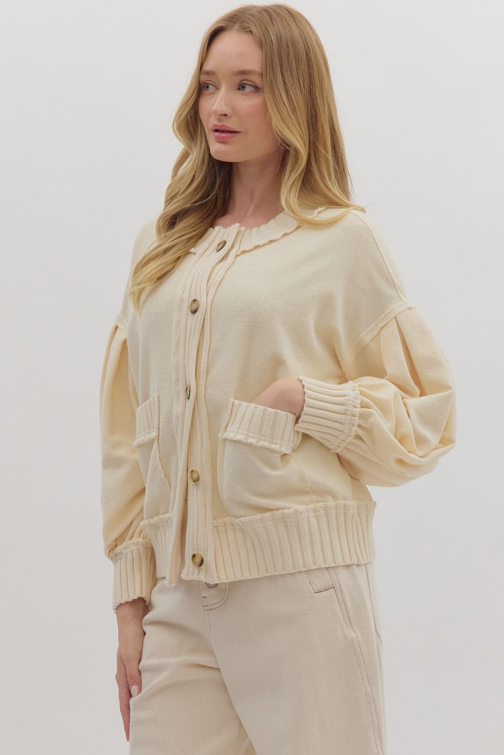Solid long sleeve knit cardigan featuring wide ribbed trim at band and pockets with raw edge accents. Button-front closure. Unlined. Knit. Non-sheer. Medium weight.