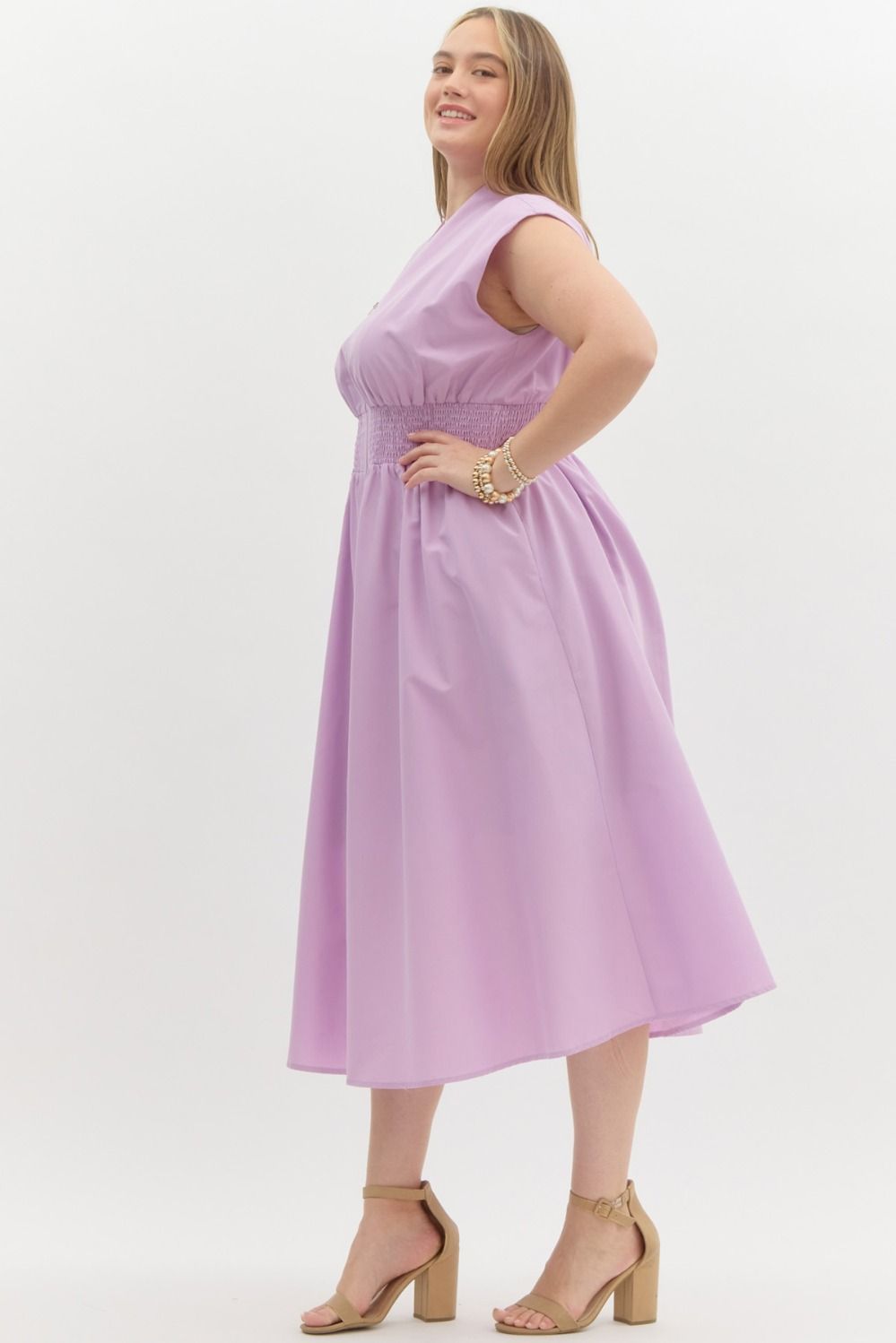 Solid v-neck sleeveless midi dress featuring dual zipper at front. Smocking at waist. Pockets at side. Lined. Woven. Non-sheer. Lightweight.