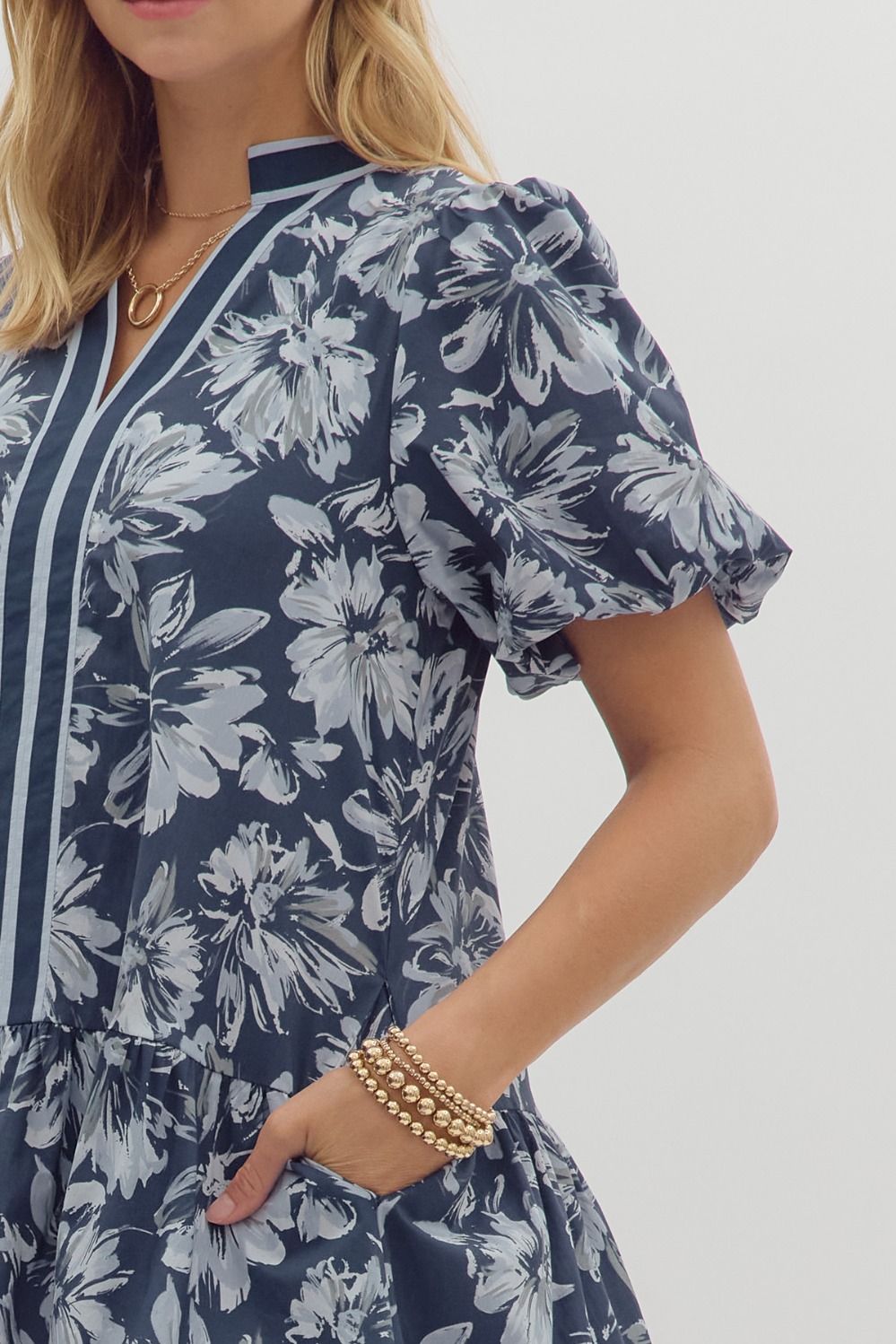 Floral print short bubble sleeve ruffle hem mini dress featuring multicolor contrast accent neck band and hem finish. Side Pockets. Lined. Woven. Non-sheer. Lightweight