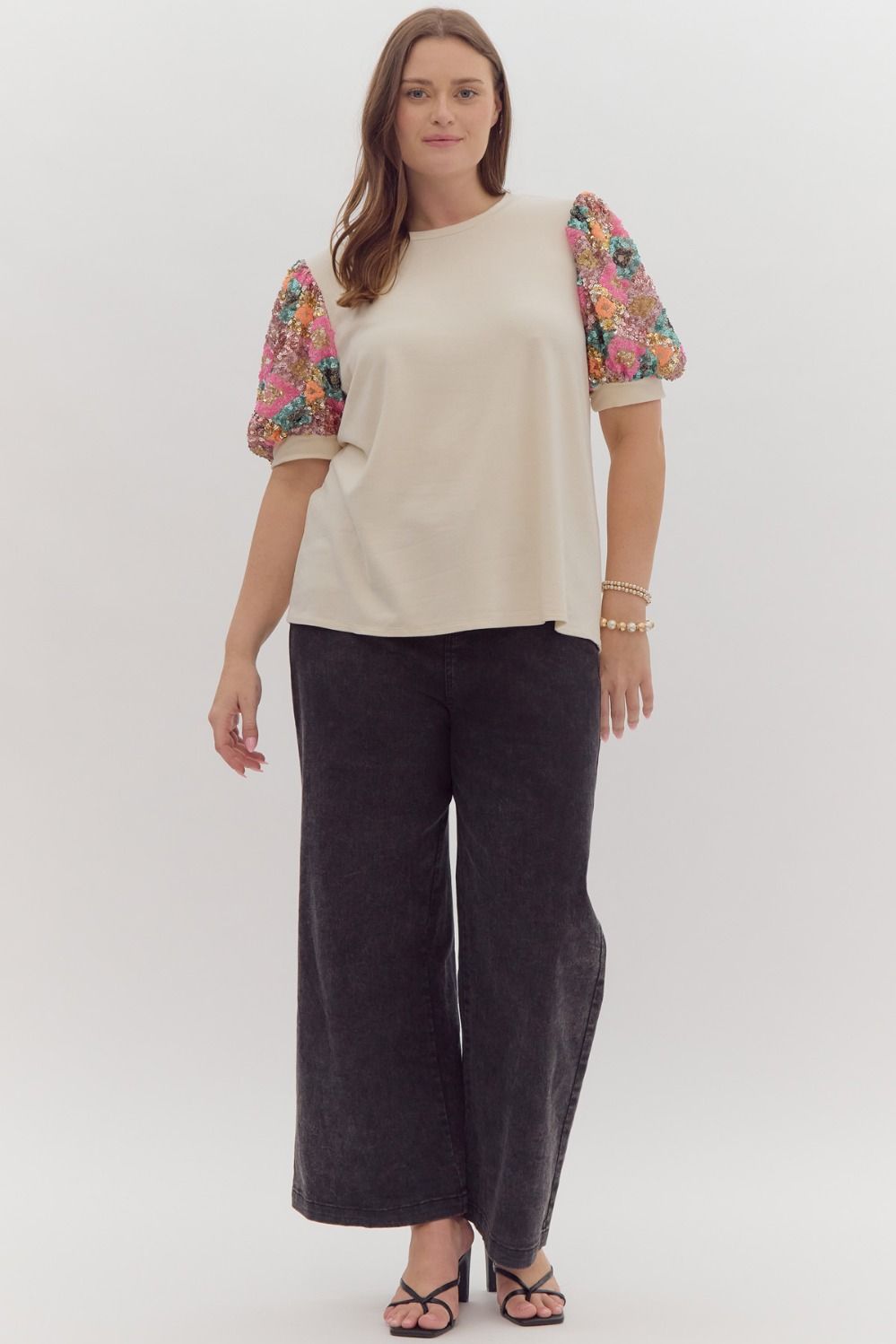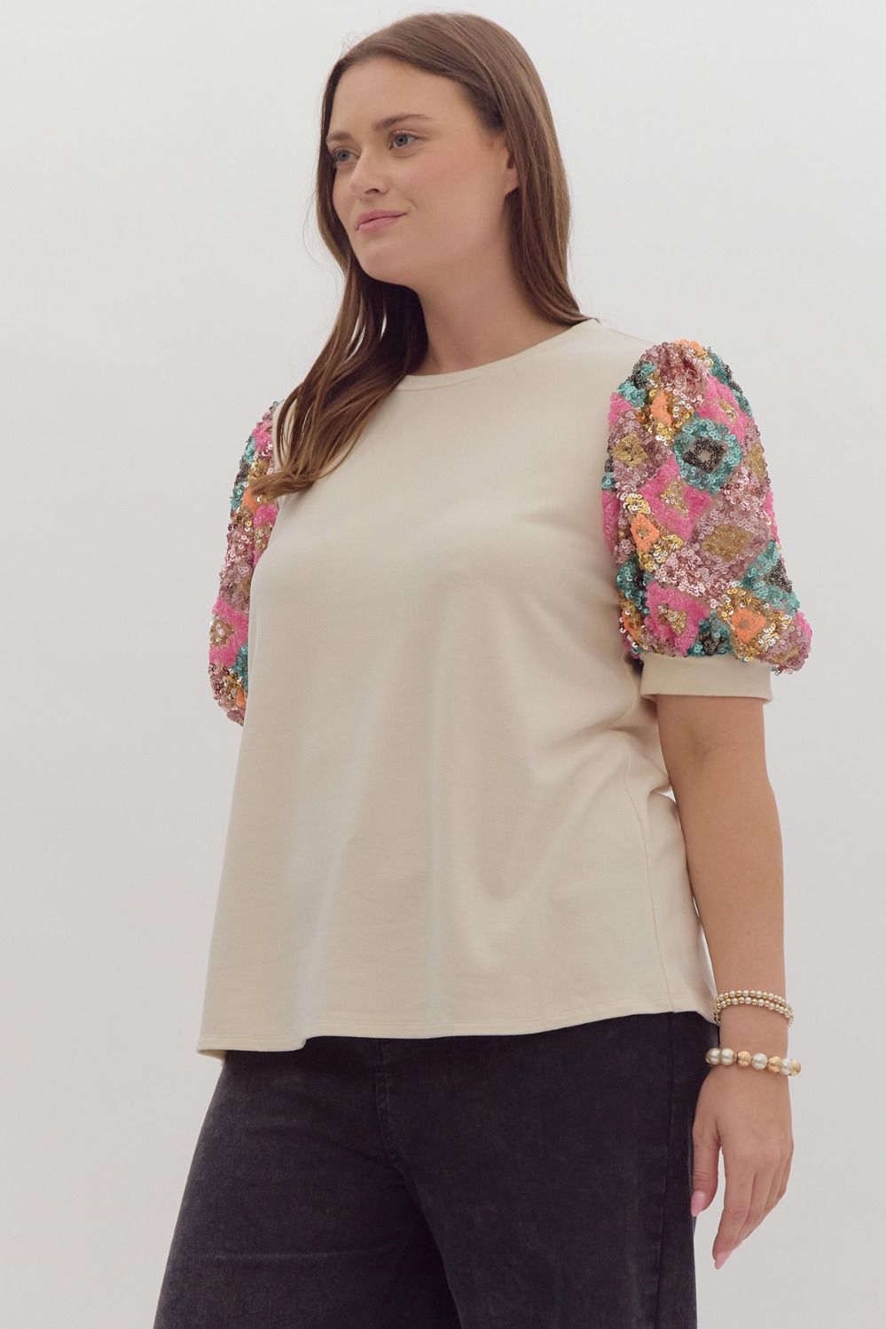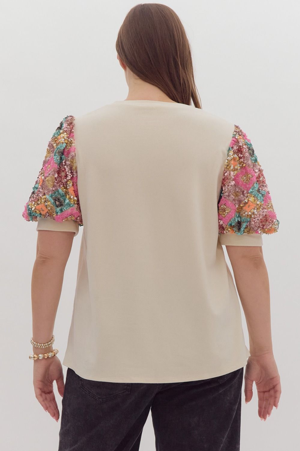 Solid short puff sleeve round neck top featuring sequined sleeves. Unlined. Knit. Non-sheer. Lightweight.