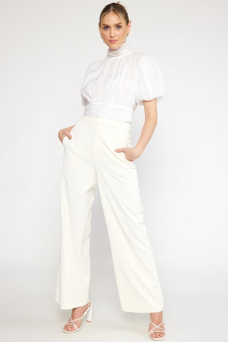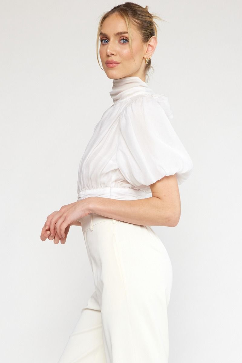 Satin high-neck puff sleeve crop top featuring ruched waist. Self tie at back neck. Invisible zipper closure at side. Lined. Woven. Non-sheer. Lightweight.