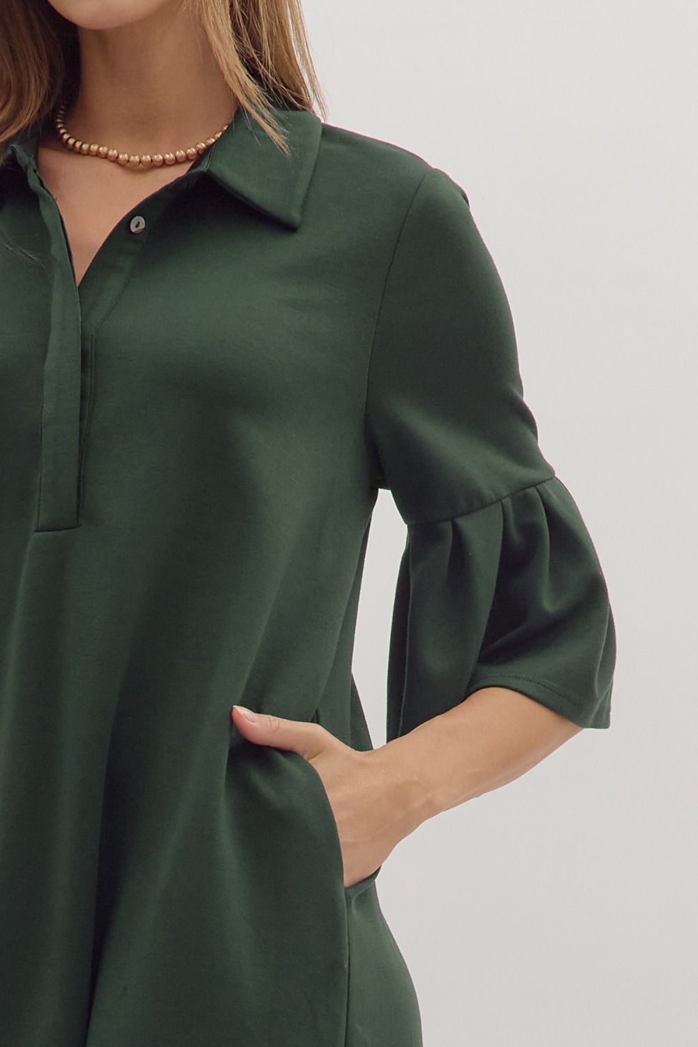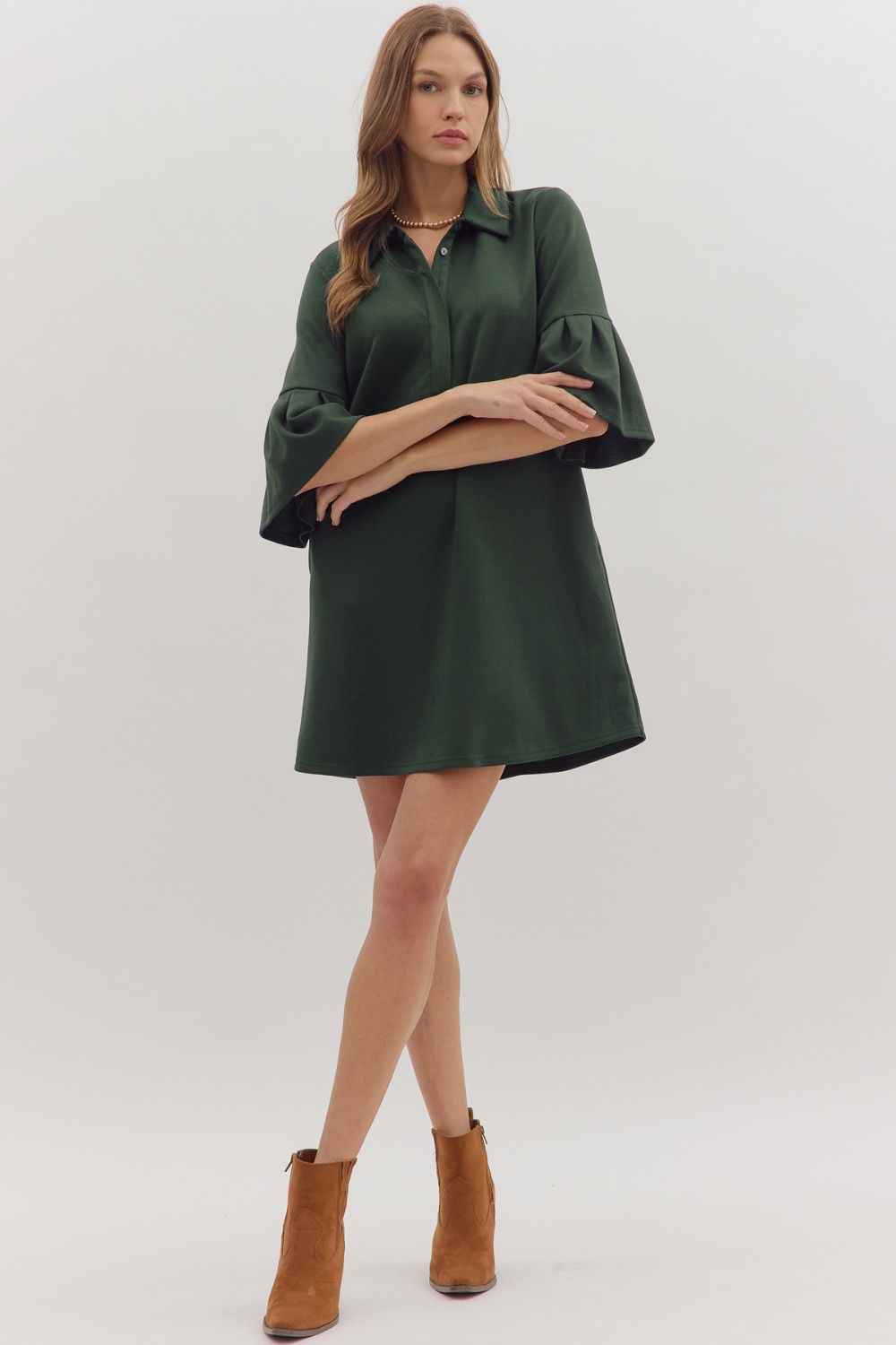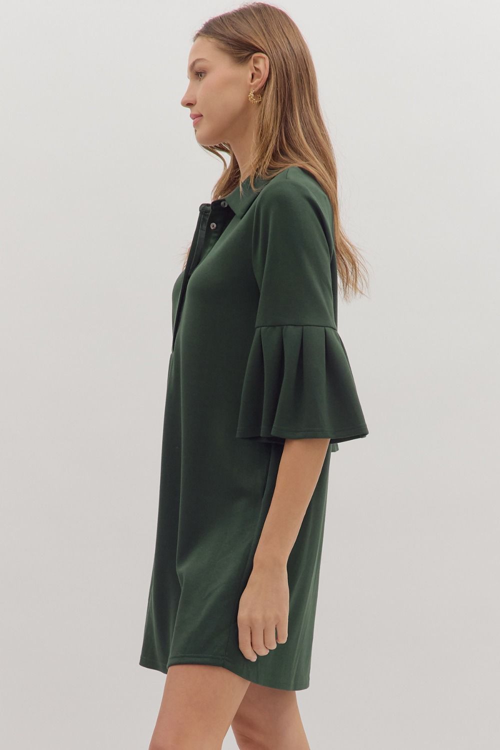 Solid collared 3/4 sleeve mini dress featuring tiered ruffle sleeve detail. Hidden button closure at front. Unlined. Knit. Non-sheer. Lightweight.