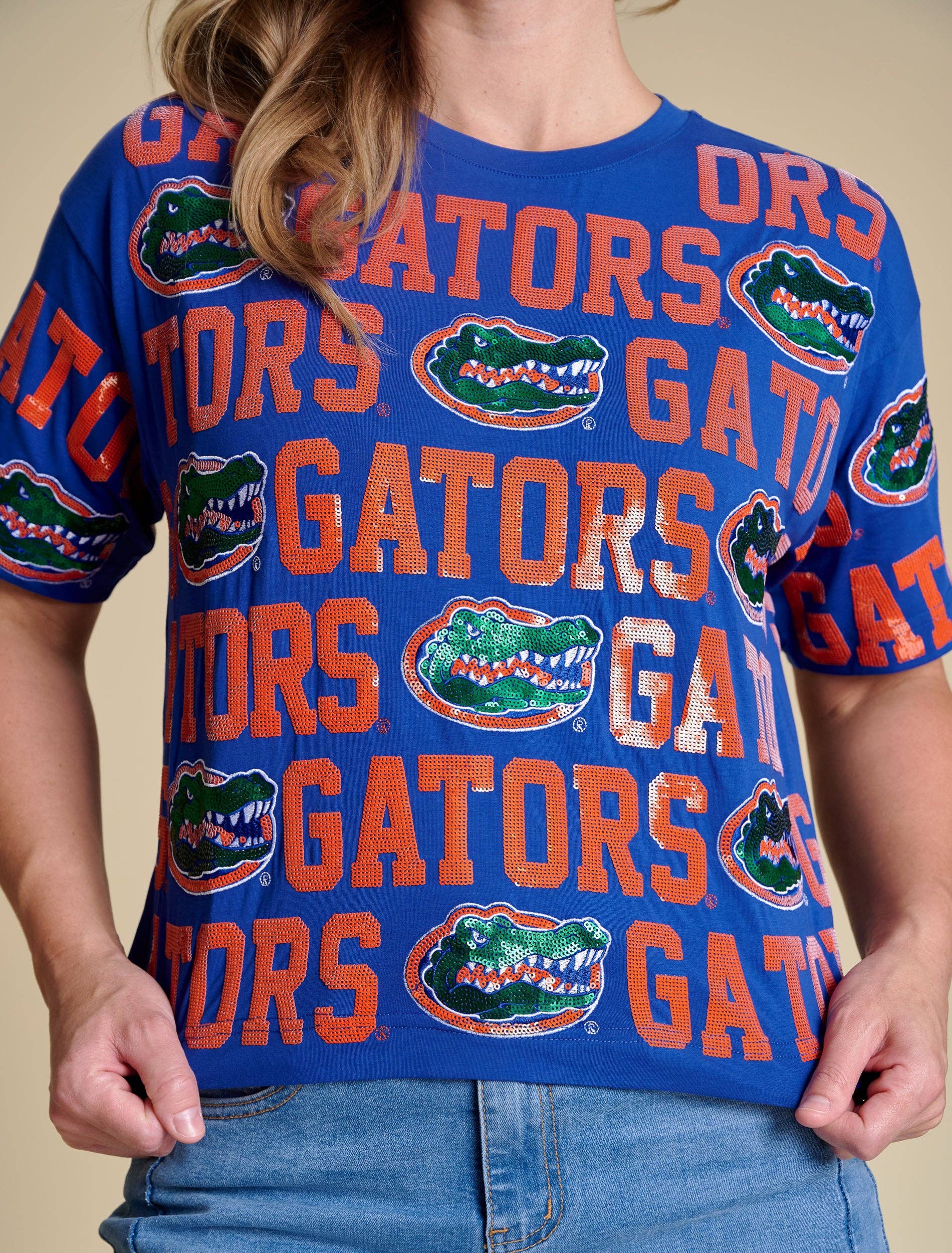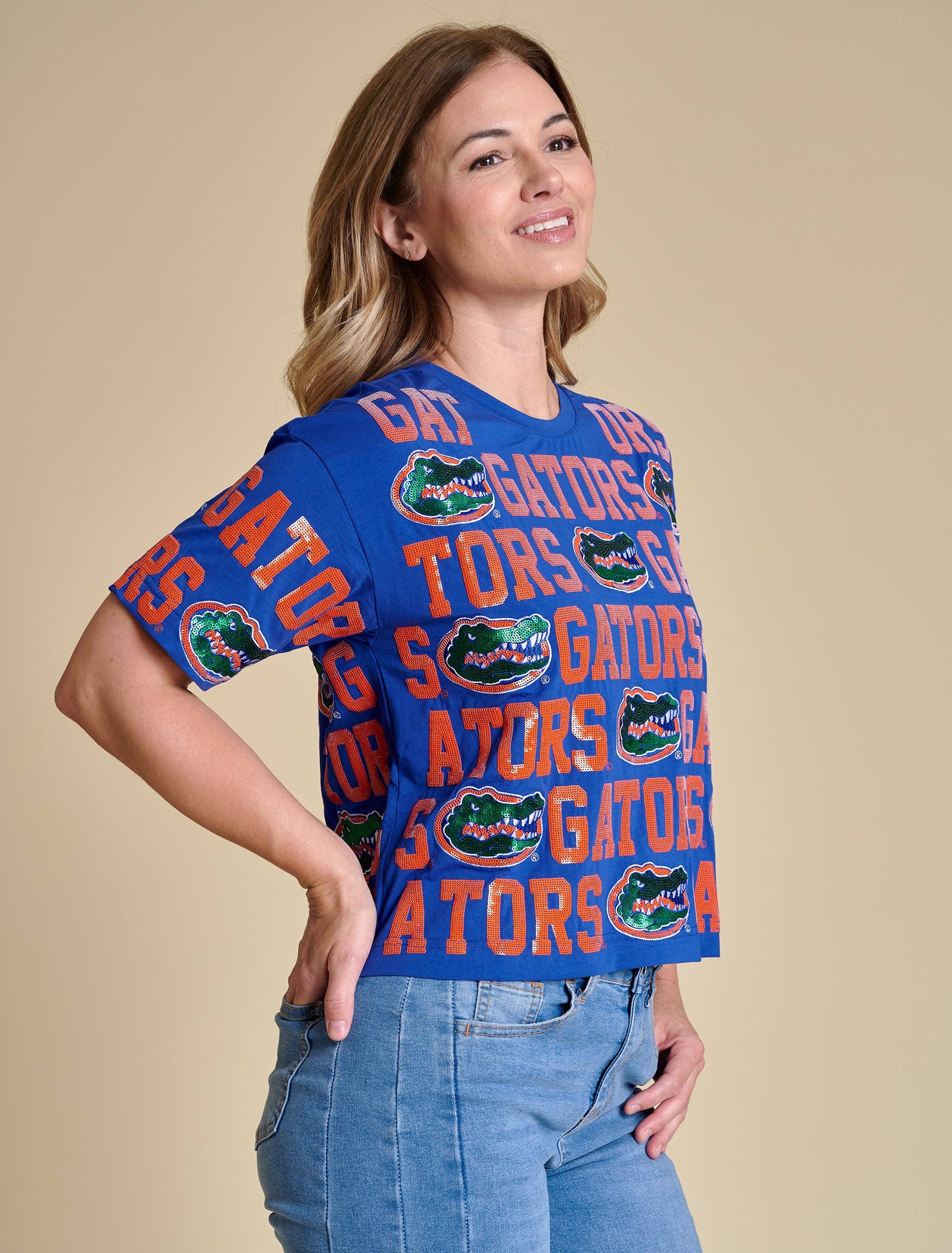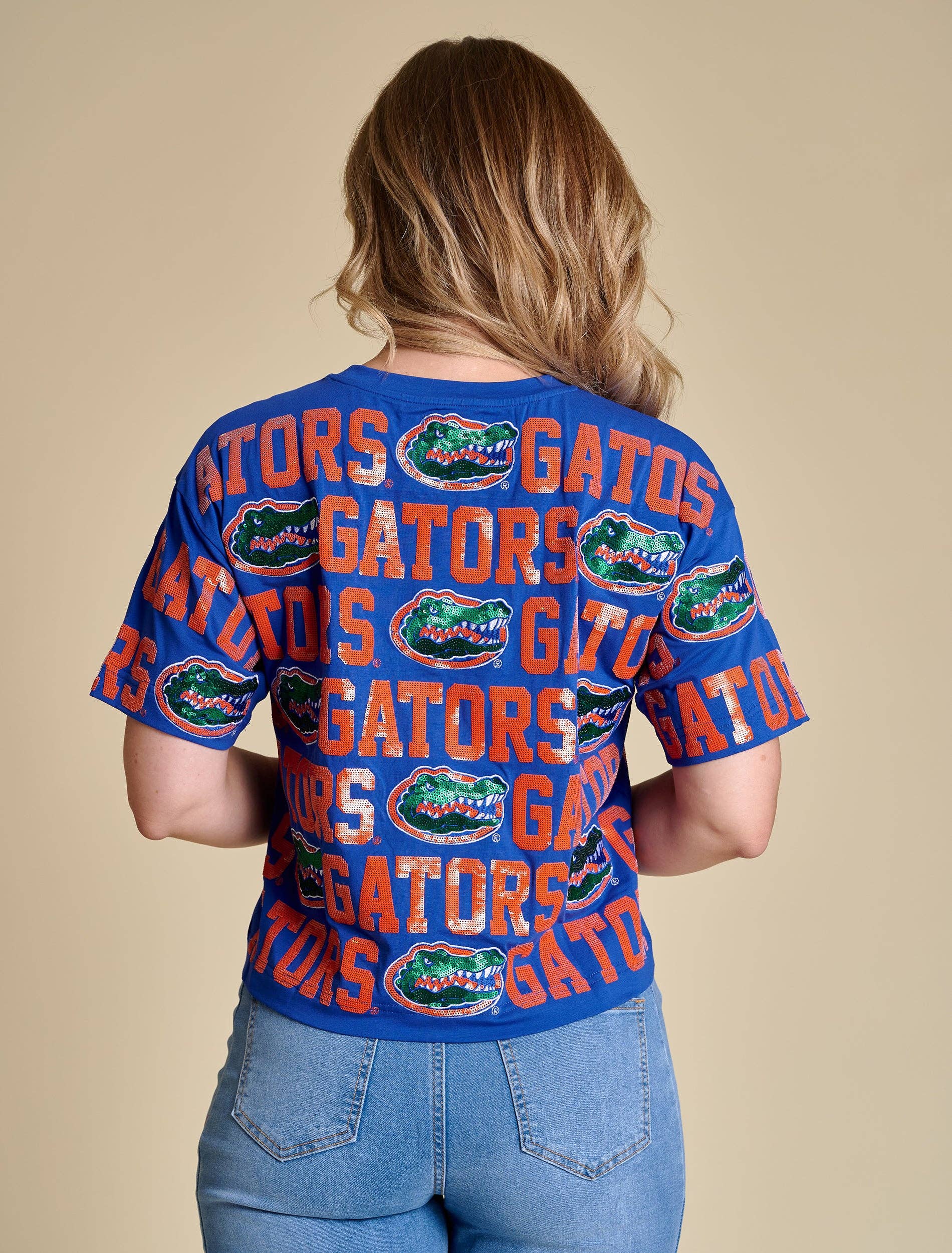 This short sleeve boxy tee takes team spirit to the next level, with a full repeat of sequin wordmarks and logos across the front and back. Cut in a relaxed silhouette, it’s the definition of cool-meets-chic. We’re styling it with a sequin mini and chunky bangles for added glam, or oversized with biker shorts and a crossbody bag for effortless edge.