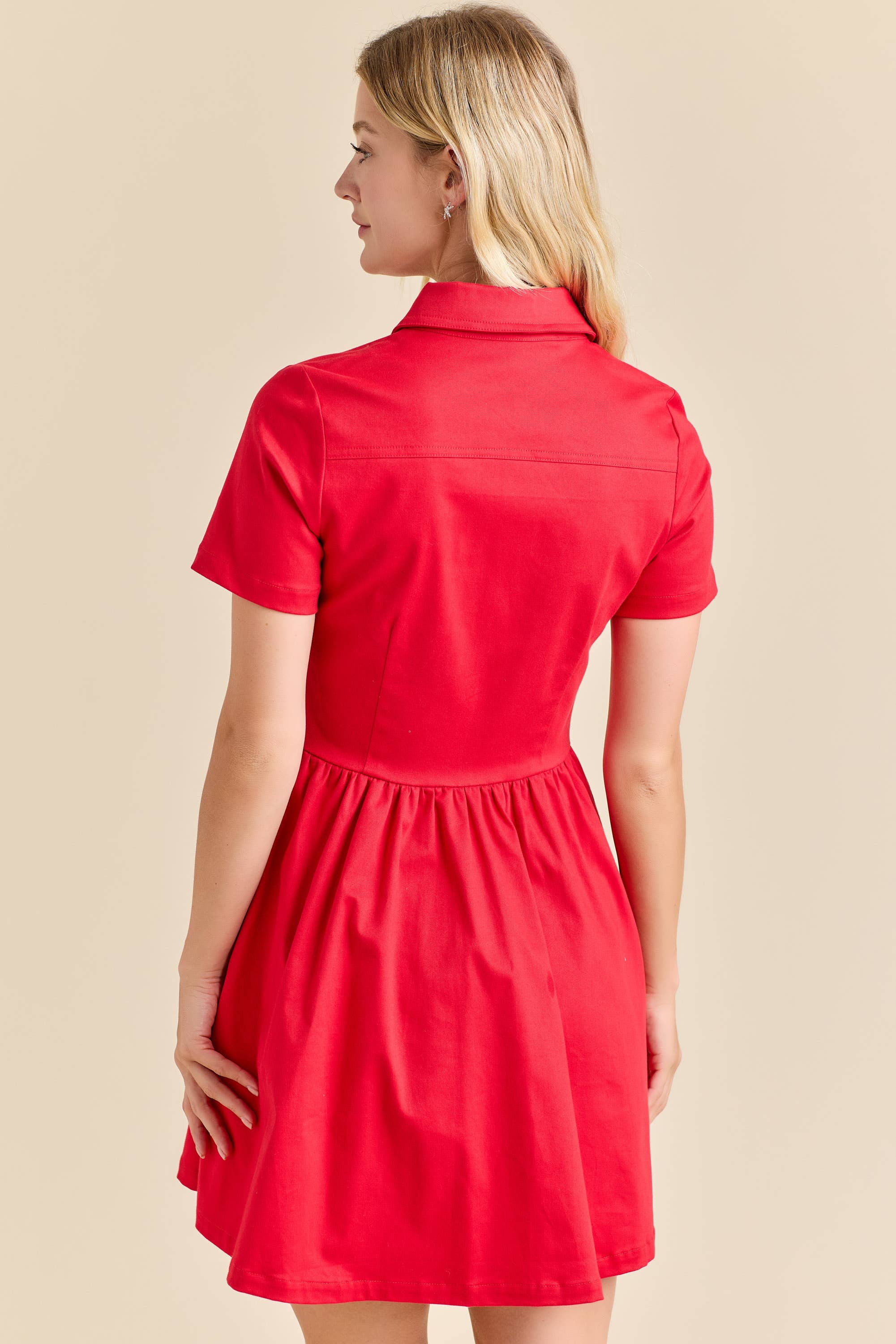Holiday dress, Christmas red dress, festive mini dress, button-down collared dress, short sleeve holiday outfit, Christmas party dress, holiday dinner outfit, seasonal gifting dress, red cotton dress, winter festive fashion