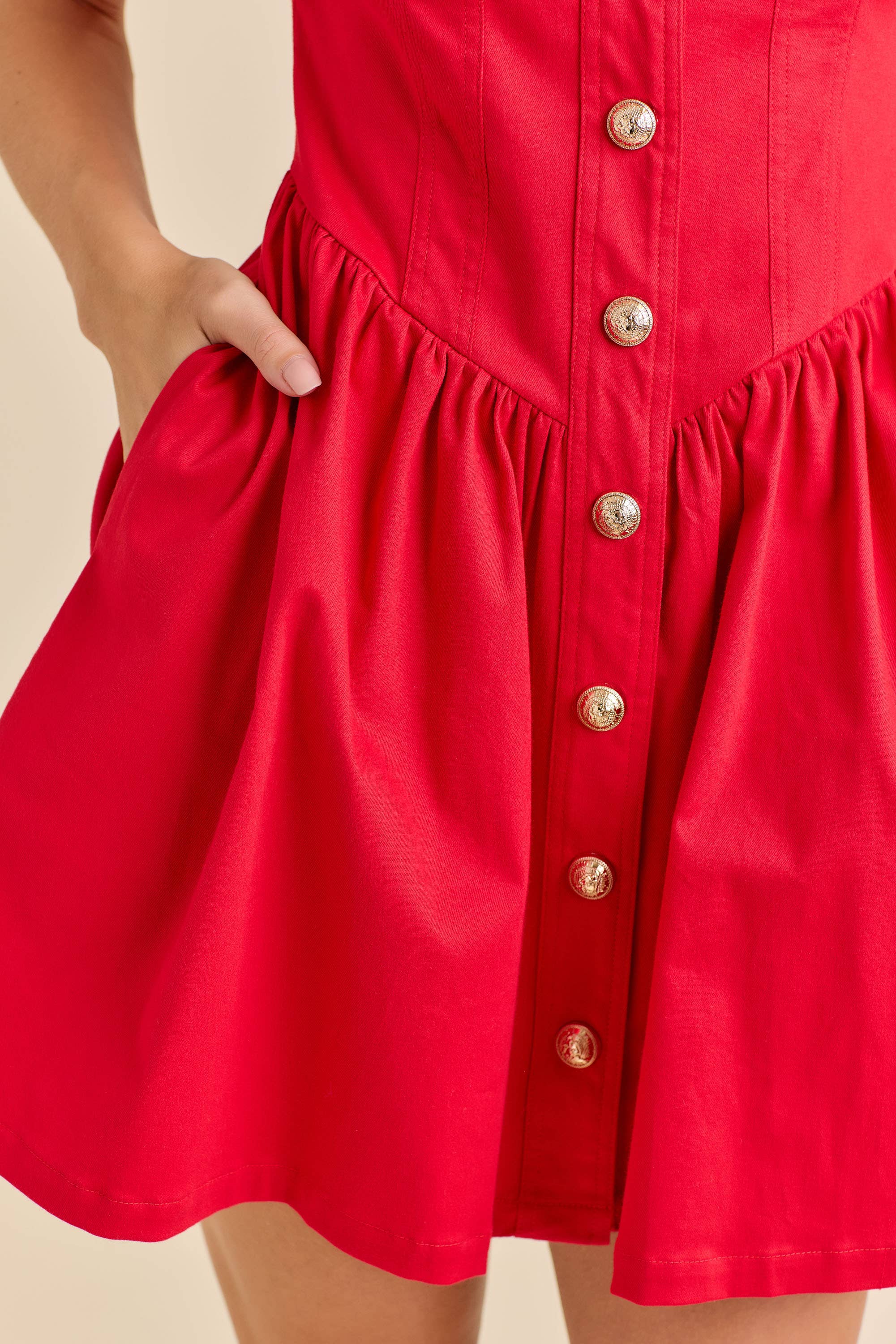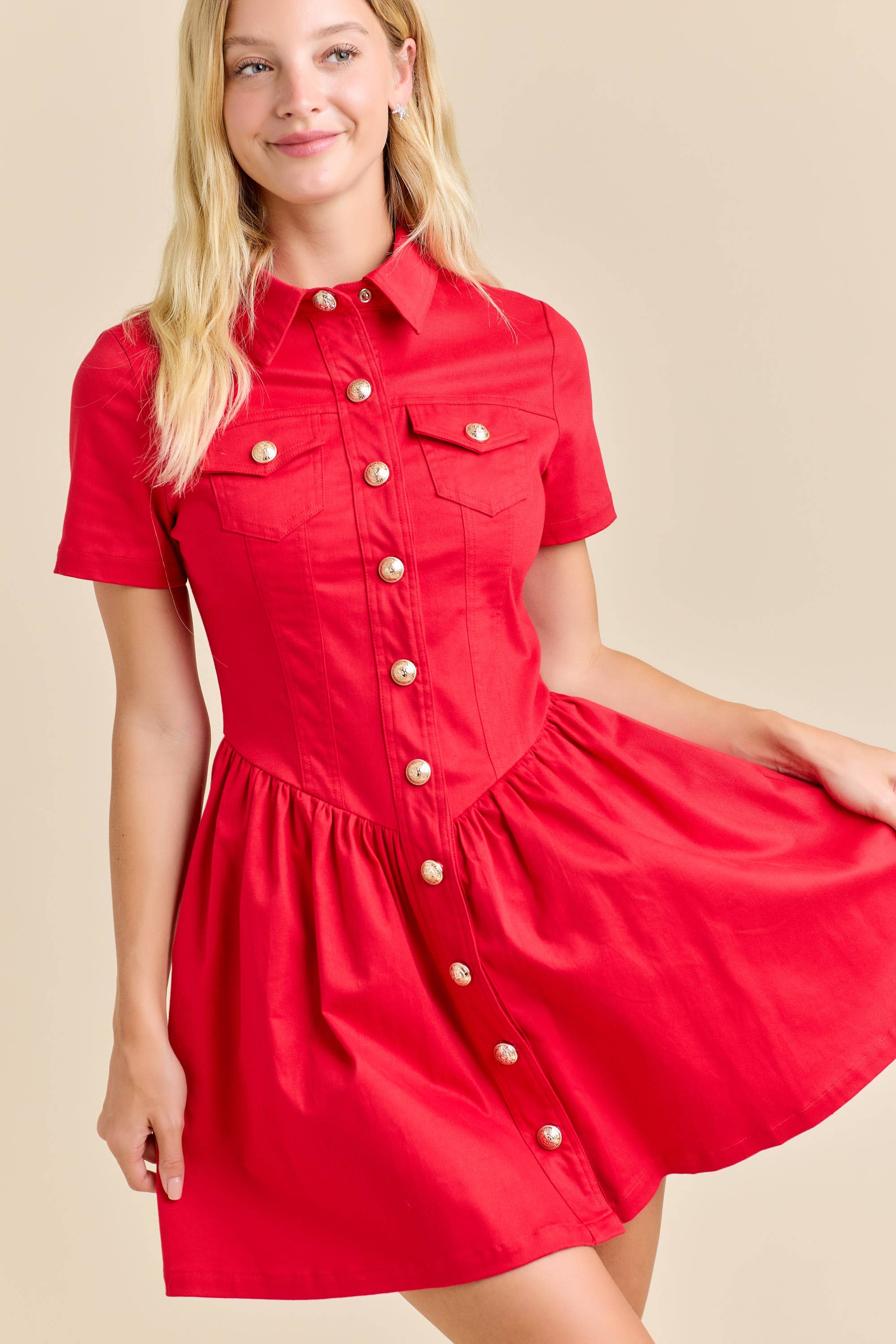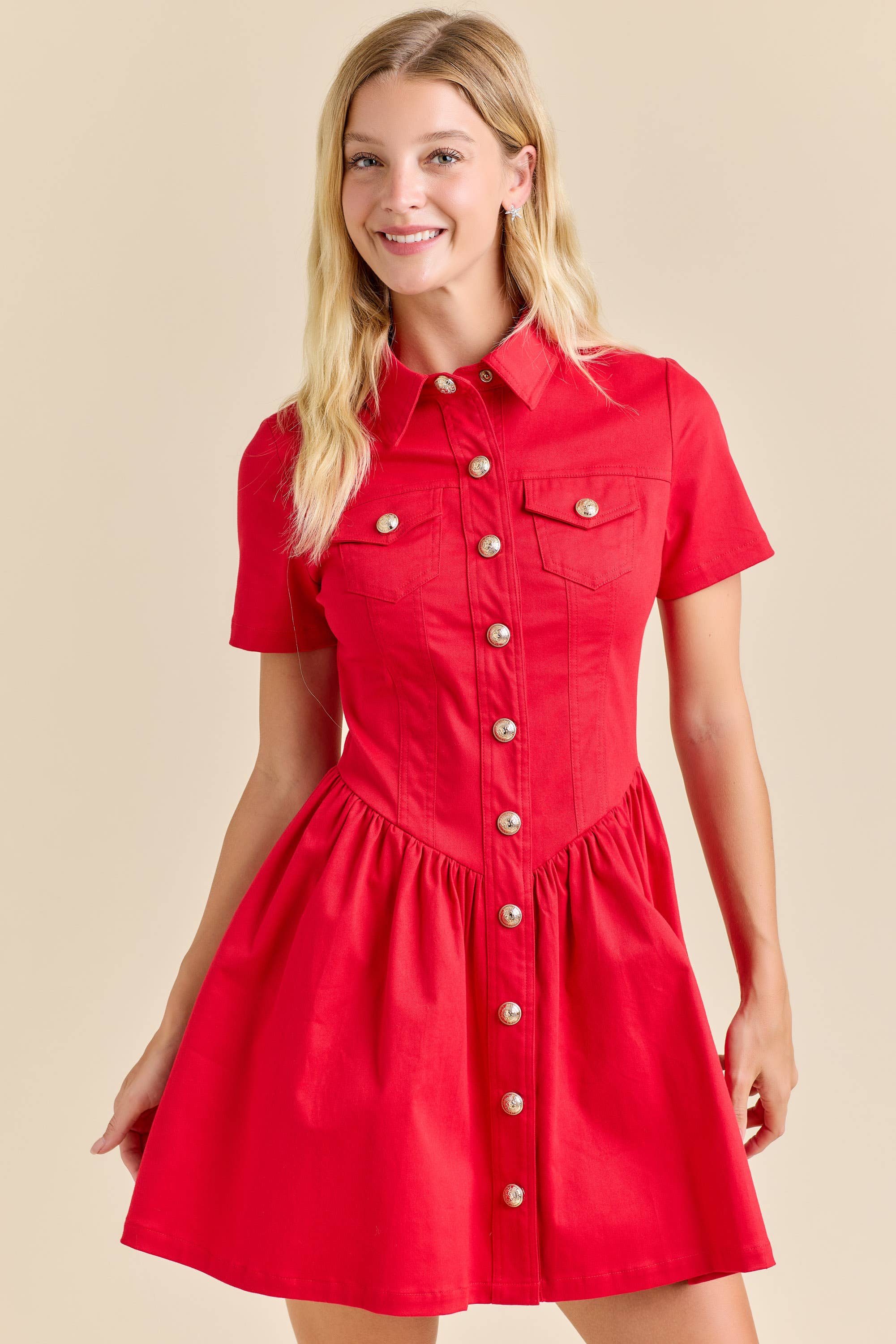 Bring festive elegance to your holiday lineup with this red button-down mini dress. Designed with a tailored collared neckline, structured bodice, and gold button details, it offers a flattering silhouette. Perfect for Christmas parties, holiday dinners, or seasonal gifting, this versatile piece transitions from day to night effortlessly.