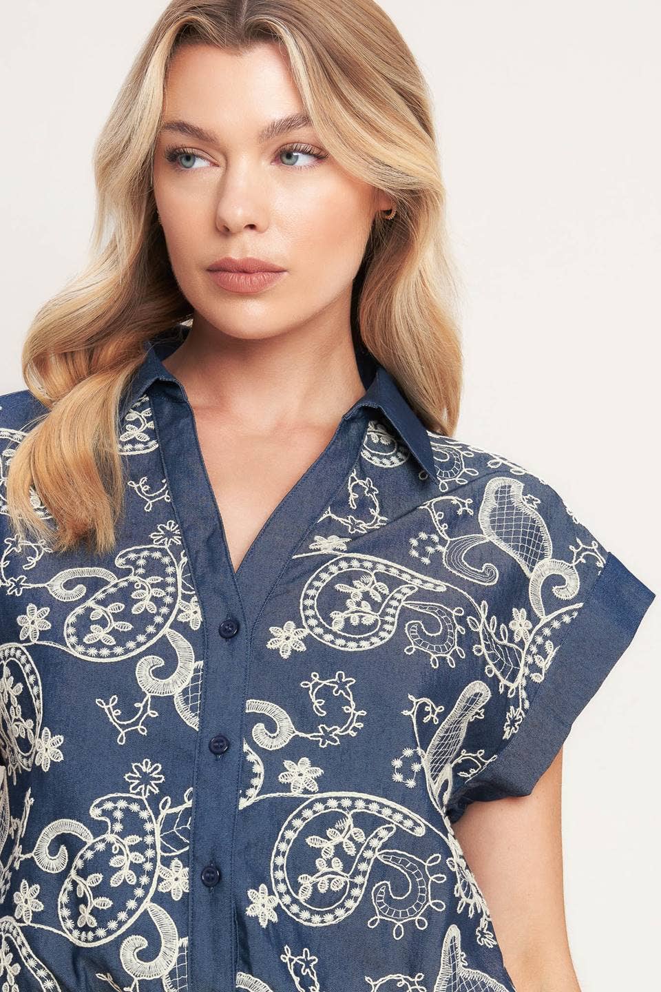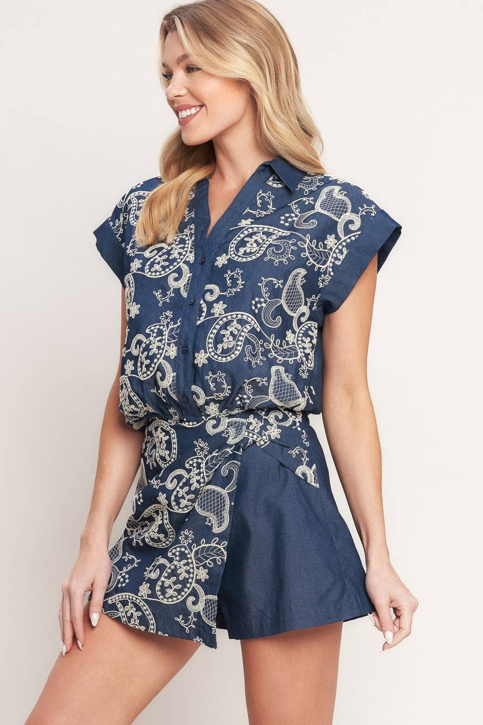 A solid and embroidery combination top featuring collar, V neck, short sleeve, front button down and elasticized waist. Matching skort IP9180T