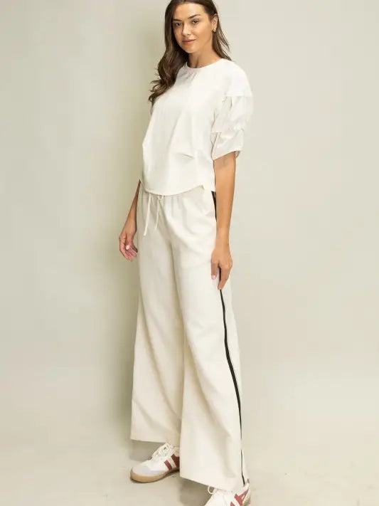 Add a fresh twist to your everyday lineup with this relaxed-fit top featuring statement ruched puff sleeves in a lightweight woven fabric. The soft knit body offers easy comfort, while the layered sleeve detail brings an elevated edge to this minimal silhouette. Perfect for casual chic styling your customers will love.