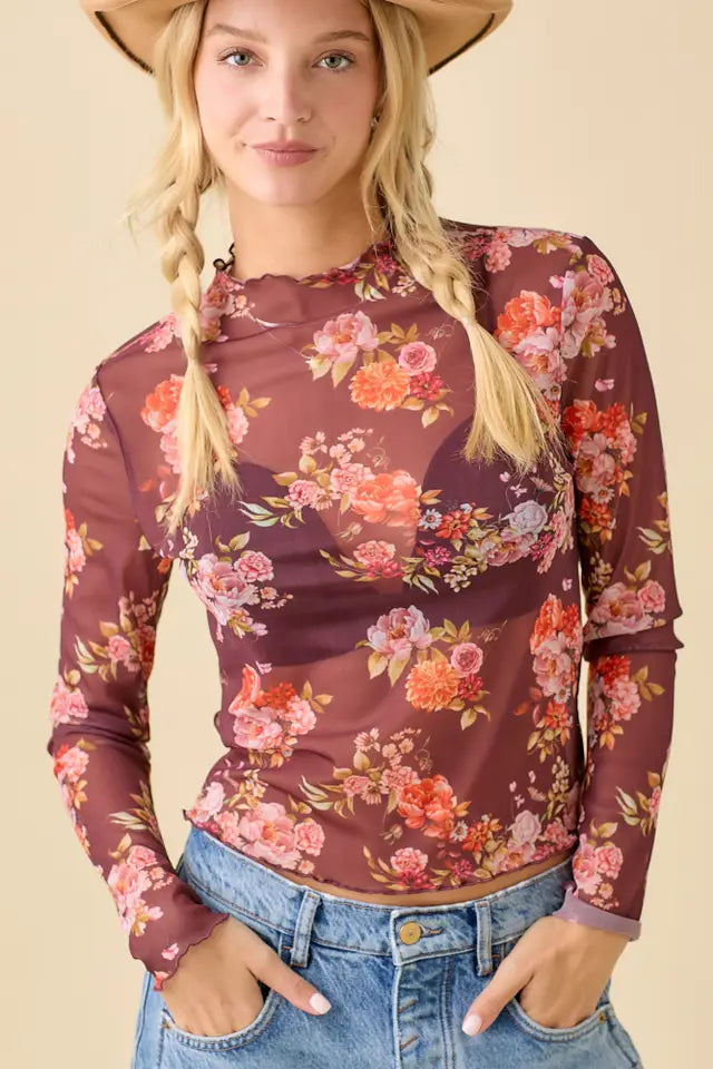 Floral Printed Long Sleeve Mesh Top
